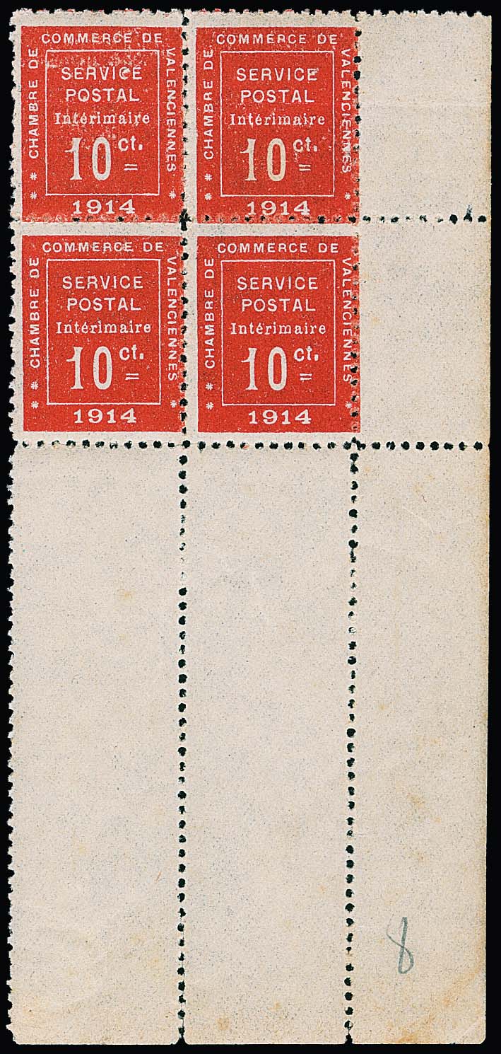 1914, Handelskammer Valenciennes, 10 C. rosa im postfrischen Viererblock aus der rechten unteren Bogenecke mit breiten Rändern. Seltene Einheit dieser lose schon gesuchten Marke. Mi. 5200,- ++