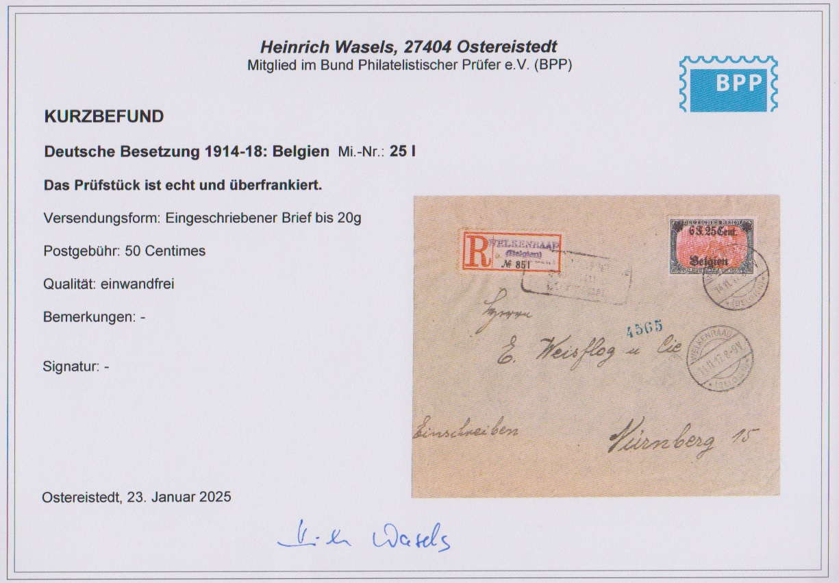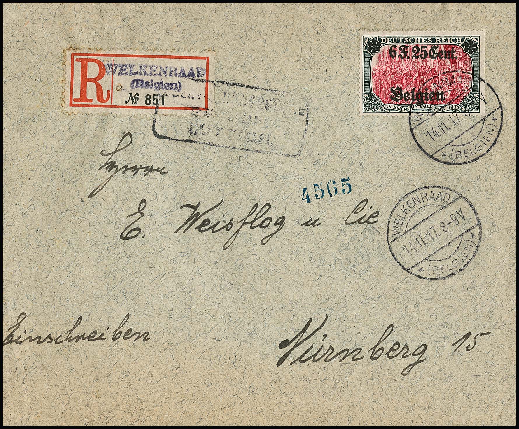 6 F. 25 C., Type I, einzeln auf Zensur-R-Brief aus Welkenraad 1917, Fotoexp. Wasels. Mi. 400,-