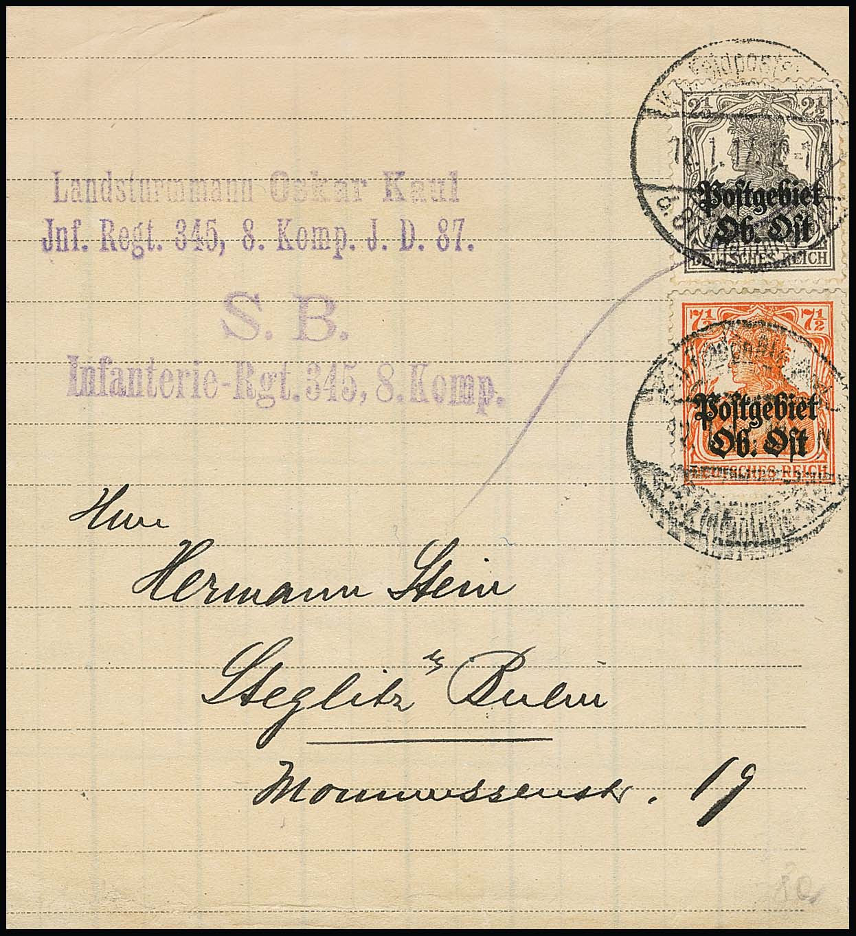 2 1/2 und 7 1/2 Pfg. auf Bedarfs-Steifband mit entsprechendem Feldpoststempel 1917 nach Berlin