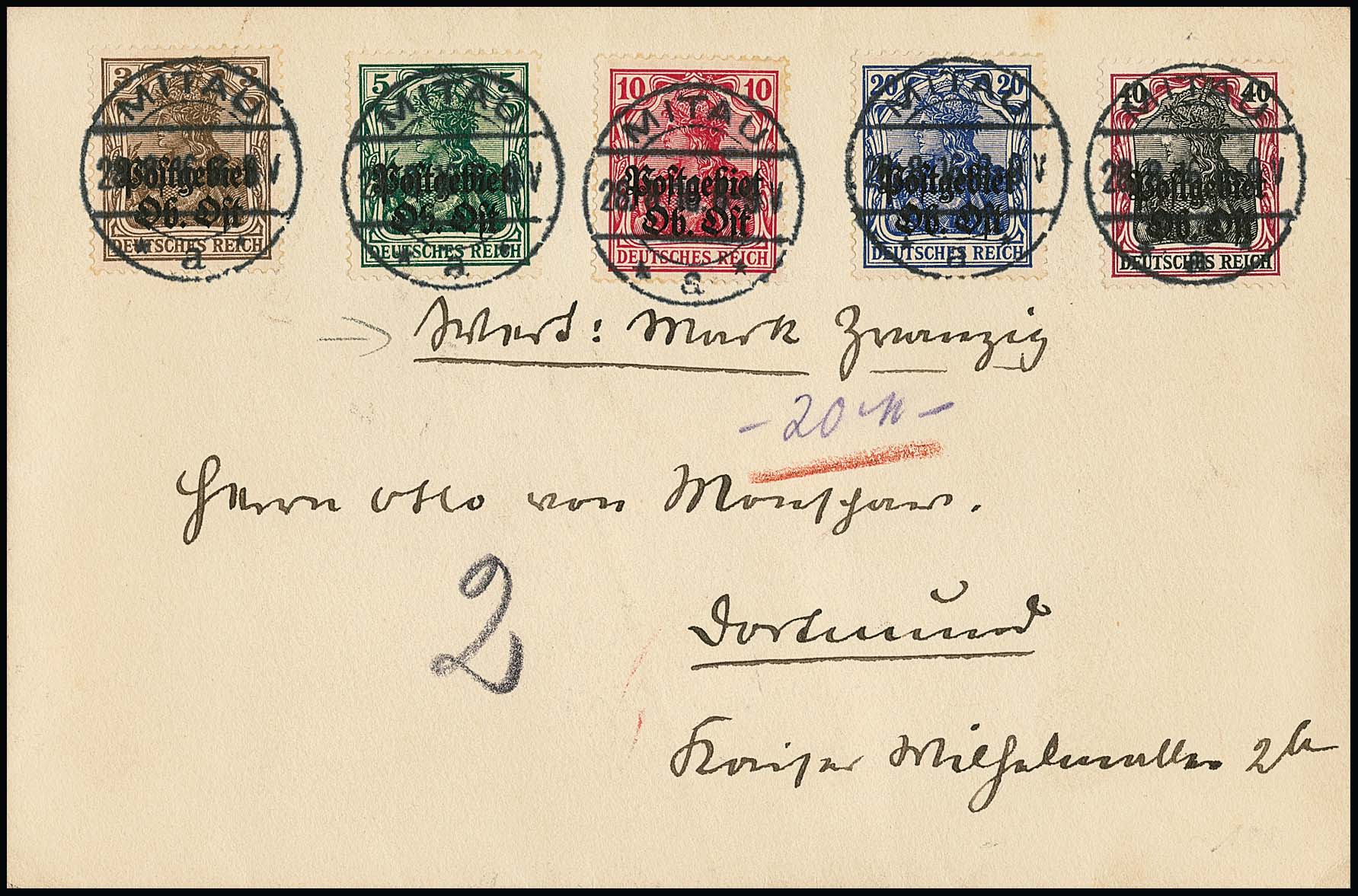 3, 5, 10, 20 u. 40 Pfg. auf Wertbrief von Mitau 1916 nach Dortmund