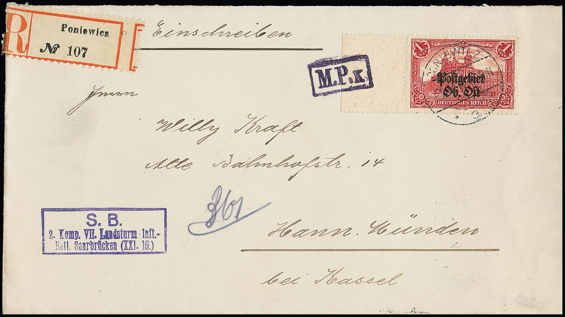 1 Mk. vom linken Rand einzeln auf R-Doppelbrief ab Poniewicz 1917 mit Zensur nach Hann. Münden