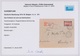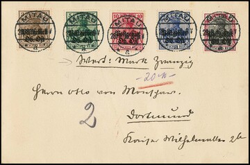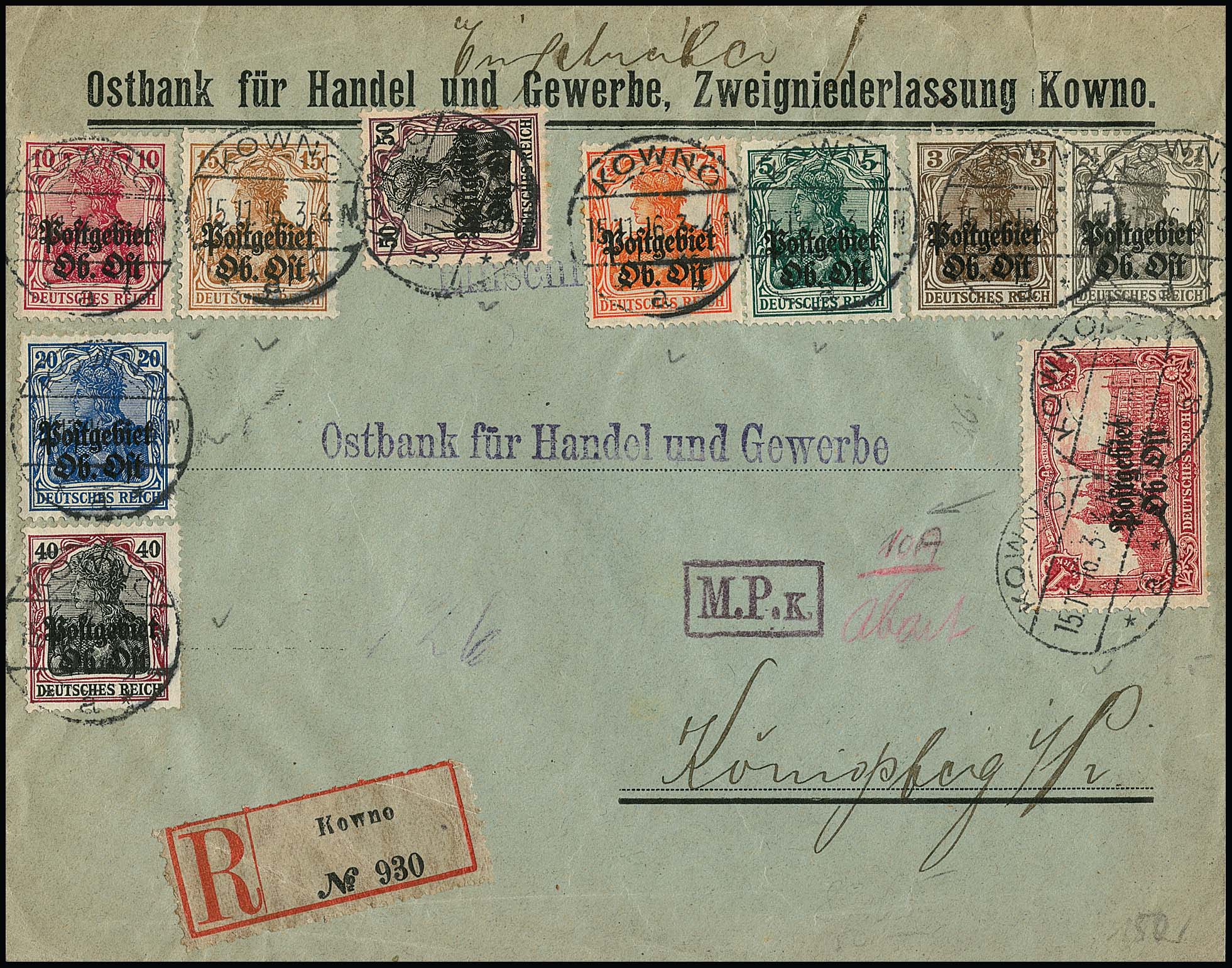 Aufdrucke, ohne 15 und 25 Pfg., dafür 1 Mk. in guter A-Zähnung, auf R-Brief (leichte Gebrauchsspuren) aus Kowno 1916 mit Zensur nach Königsberg