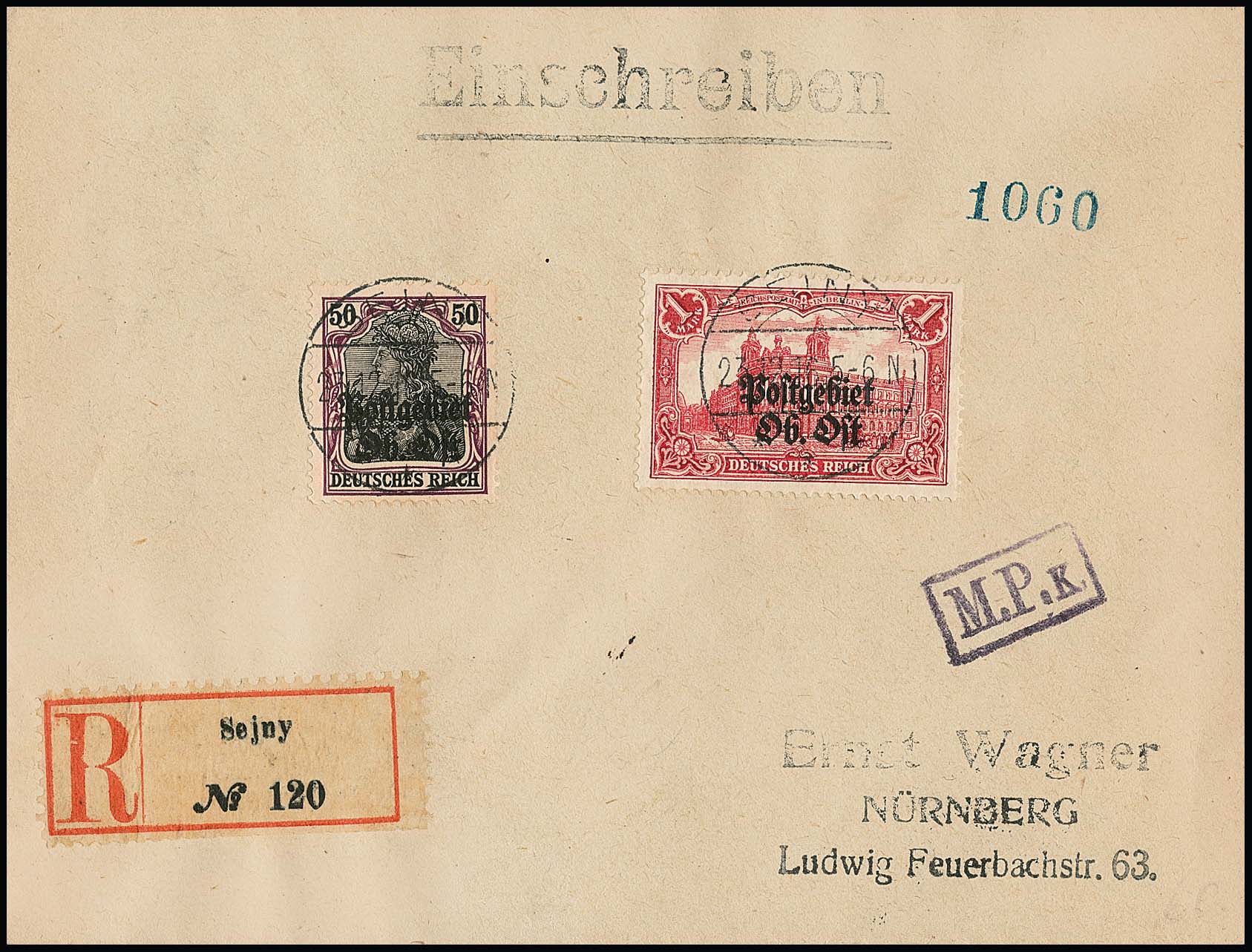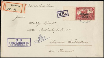 50 Pfg. und 1 Mk. auf Zensur-R-Brief mit besserem Stempel "Sejny" 1916