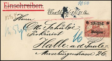 1 Fr. 25 C. (nebst 50 C.), sowie 2 Fr. 50 C., gute Type IIB, auf zwei Zensur-R-Briefen aus Brüssel nach Deutschland