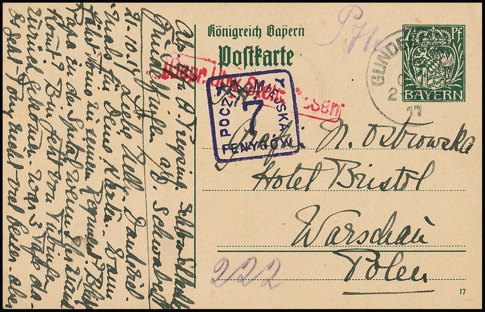 1917, zwei bayerische Ganzsachenkarten 7 1/2 Pfg. grün von Woerishofen bzw. Gundelfingen, Okt./Nov. 1917, aus gleicher Korrespondenz nach Warschau, dort mit rotem bzw. blauem Gebührenstempel für die Zustellung im Ortsbereich versehen, nebst Zensur (nach Ausserkurssetzung der Stadtpostmarken)