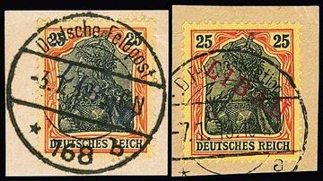 Libau, 25 Pfg., Aufdrucktype II in violettblau und rot auf zwei Briefstücken, sign. Drahn, Vossen, Kosack, Krumhaar u.a. Mi. 1050,-