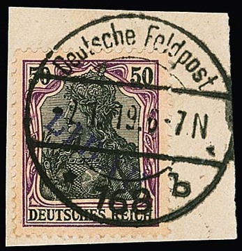 Libau, 50 Pfg., Aufdrucktype II in violettblau auf Briefstück, sign. Krumhaar. Mi. 650,-