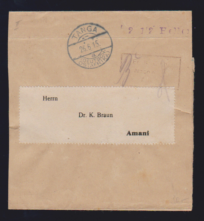 "Tanga", 1915, Steg-K2 nebst Barfrankierungsstempel "Fr. lt. Einn. Nachw. in Tanga" und L1 "2 1/2 Heller" auf Streifband nach Amani