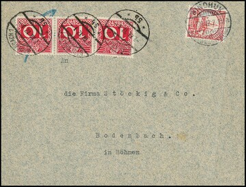 10 Pfg. auf unterfrankiertem Brief von Windhuk 1912 nach Böhmen mit drei österr. Nachportomarken zu 10 H., ferner 10 Pfg. per drei auf etwas unfrischem R-Brief aus Rehoboth 1904, sowie Ganzsachenkarte 5 Pfg. 1905 mit K1 "Bethanien"