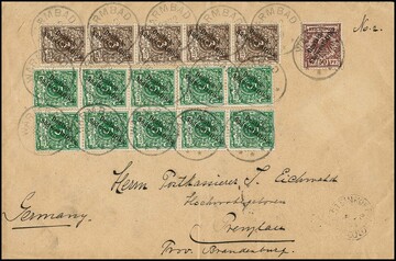 3 Pfg. im Fünferstreifen, in Mischfrankatur mit zwei Fünferstreifen nächste Ausgabe 5 Pfg. sowie 50 Pfg., auf offensichtlich als Einschreiben frankiertem Brief von Warmbad 1900 via Steinkopf (vs. K1) und Cape Town nach Prenzlau