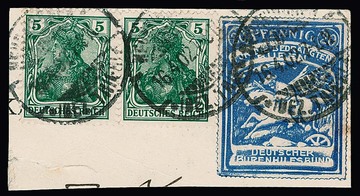 "Deutscher Burenhilfsbund", 1902, seltene Vignette 20 Pfg. blau, nebst zweimal 5 Pfg. Germania, auf Briefstück