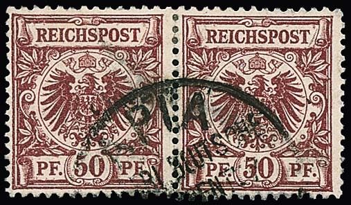 Vorläufer Krone-Adler 50 Pfg. braunrot im Paar (linker Wert winziger Eckbug) mit K1 von Apia, sign. Steuer. Mi. 1000,-