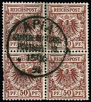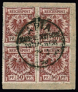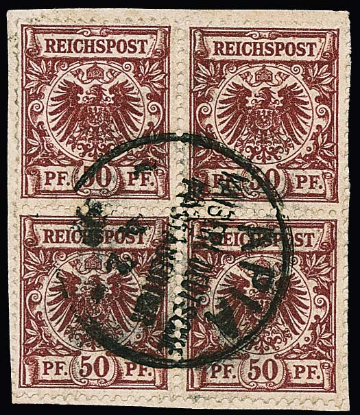 Vorläufer Krone-Adler 50 Pfg. braunrot, Viererblock mit zentrischem K1 "Apia" vom 15.10.1891. Linke untere Marke kleine Randfehler, sonst gut, rechte untere Marke seltener Plattenfehler "Kerbe in der rechten oberen Banderole" der Urmarke, Michel nicht gelistet. Mi. 2000,- + Plattenfehler, Attest Jäschke-L.