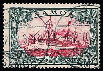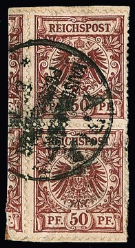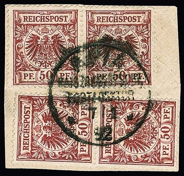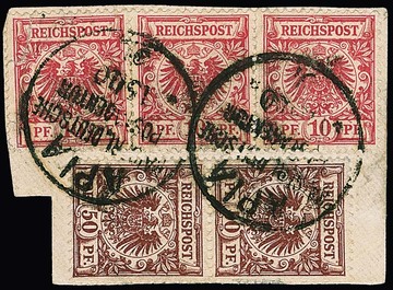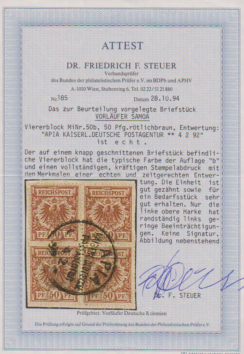 Vorläufer Krone-Adler 50 Pfg. rötlichbraun, gute Farbe, waagerechtes Paar (winzige Zahnverkürzungen) und senkrechtes Paar (überdurchschnittlich gute Erhaltung) auf Briefstück mit klarem K1 Apia" aus 1892. Attest Steuer. Mi. lose 2000,-