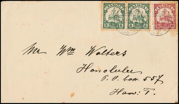 5 Pfg. im Paar, nebst 10 Pfg., je fleckig, auf seltenem Brief von Apia 1911 nach Honululu/Hawaii mit Ankunftsstempel