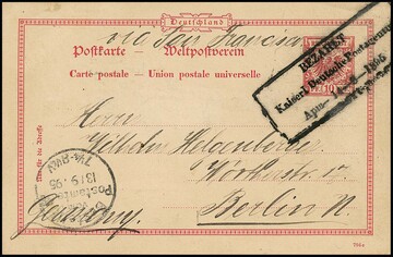 Vorläufer, 1895, 14.8., Krone-Adler-Ganzsachenkarte 10 Pfg. mit Ra3 "BEZAHLT Kaiserl. Deutsche Postagentur Apia" ("Apia 4") nach Berlin, Hb. 800 P.
