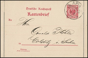 Mitläufer, Krone-Adler-Kartenbrief-Ganzsache 10 Pfg. als Sammlerbeleg von Apia, 9.8.1900, nach Colditz/Sachsen gelaufen mit Ankunftsstempel, Attest Steuer