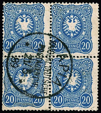 Vorläufer 20 Pfg. im Viererblock (kleine Mängel) mit zentr. K1 von Apia, 21.5.1889, Mi. 800,-