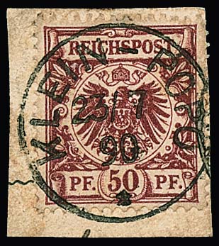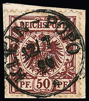 Vorläufer Krone-Adler 50 Pfg. bräunlichrot auf kleinem Briefstück mit K1 "Klein-Popo", 23.7.90. Attest Jäschke-L. "fehlerfrei". Mi. 550,-