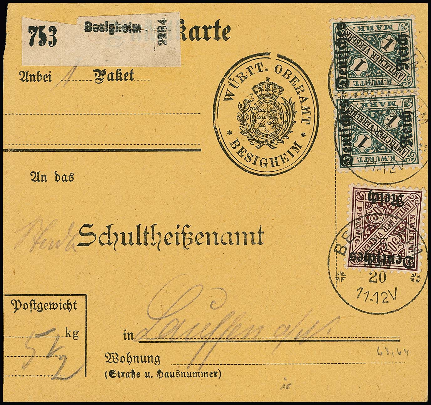 50 Pfg. und Paar 1 Mk. Württemberg auf Dienst-Paketkarte von Besigheim 1920 nach Lauffen. Seltene Frankatur auf einer Paketkarte!