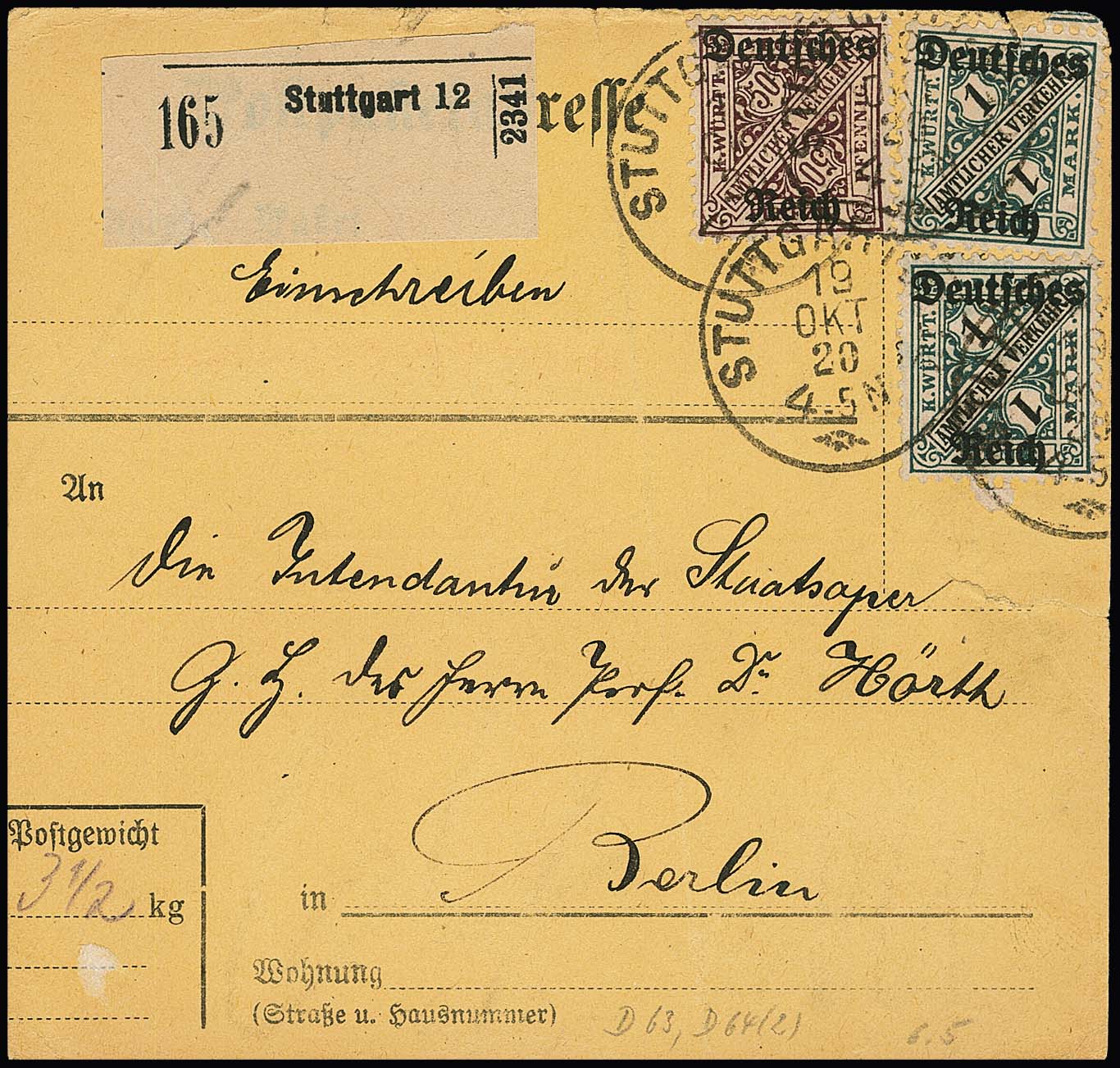 50 Pfg. und zweimal 1 Mk. Württemberg auf eingeschriebener Staatsdienst-Paketkarte von Stuttgart an den Intendanten der Staatsoper in Berlin 1920. Kleine Mängel (statt vorgeschriebenem roten einen schwarzen Paketzettel verwandt)