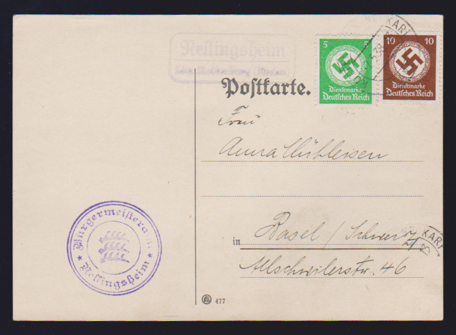5 (oben ein kurzer Zahn) und 10 Pfg. Behördendienst in seltener Verwendung auf Bedarfs-Landpost-Auslandskarte aus Rellingsheim 1938 nach Basel