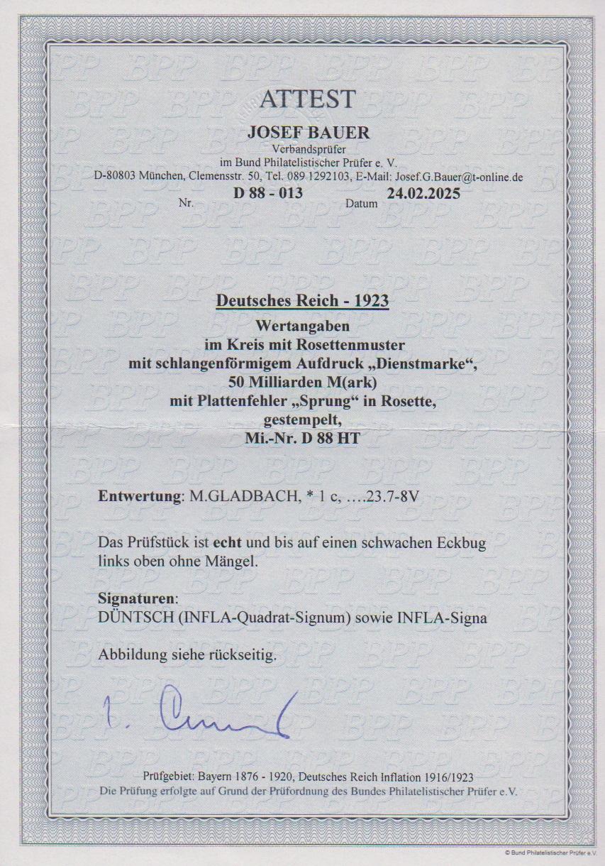 50 Milld. Mk. mit "Sprung in der Rosette" gestempelt, ganz winziger Eckbug, gut sign. Düntsch, Infla sowie Attest Bauer. Mi. 1000,-