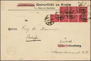 20 Mk. Arbeiter mit liegendem Wasserzeichen, 40 Exemplare in meist großen Einheiten rückseitig, vorderseitig Siebenerblock 100 Mk., als portogerechte Frankatur auf zur Präsentation dreiseitig geöffnetem Brief von Berlin, 4.8.1923, nach Rostock. Für eine solche Frankatur gute Bedarfserhaltung (wenige Werte kleine Zahnfehler etc.), es handelt sich um eine bedeutende Seltenheit der Infla-Dienstmarken, keine weitere Frankatur mit so vielen Exemplaren der Nr. 75Y registriert! Attest Weinbuch. Mi. 7760,- +