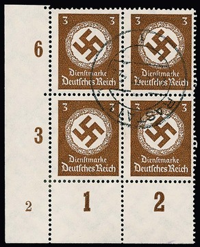 3 Pfg. Behördendienst im rundgestempelten Viererblock aus der linken unteren Bogenecke mit seltener Platten-Nr. "2" (Michel unbekannt!)