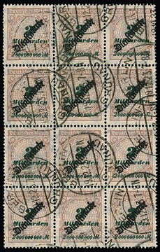 2 Milld. Mk. im seltenen und überdurchschnittlich sauber gestempelten Zwölferblock mit Stempel "Berlin-Grunau". Michel der losen Marken 1800,- ++, Attest Tworek "einwandfrei"