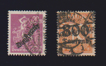 800 T. a. 30 Pfg., gutes Wz. 1, sowie 20 Mk. mit liegendem Wasserzeichen, je gest., sign. Infla, Peschl, Oechsner. Mi. 690,-