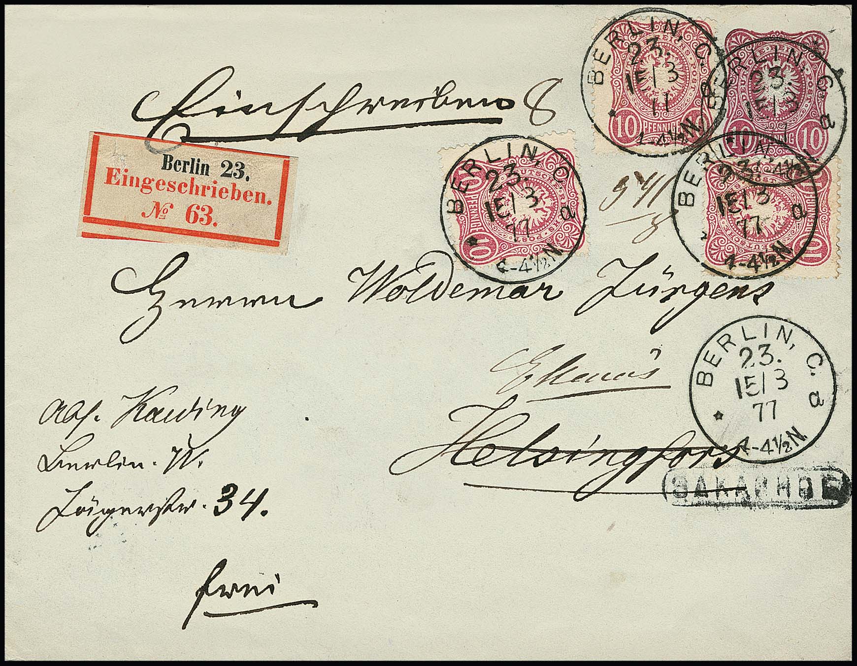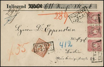 10 Pfge. rosa per drei (eine min. "eckrund") auf Ganzsache 10 Pfg., von Berlin 1877 eingeschrieben nach Helsingfors/Finnland mit inländischer Weitersendung, dazu weiterer Brief 1882 und Postkarte 1886, ebenfalls je nach Finnland