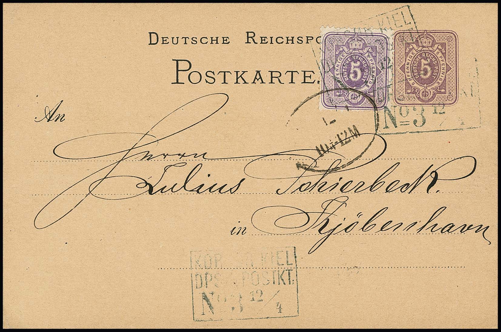 Drei Schiffspostkarten der Linie Korsöer-Kiel je mit Fremdentwertung durch dänischen Schiffspost-Ra3, 1877 in schwarzblau auf Karte 5 Pfg. mit ZuF 5 Pfge. ("Korsöer-Kiel No. 3"), sowie "No. 1" und "No. 3" auf zwei Karten 1891/98