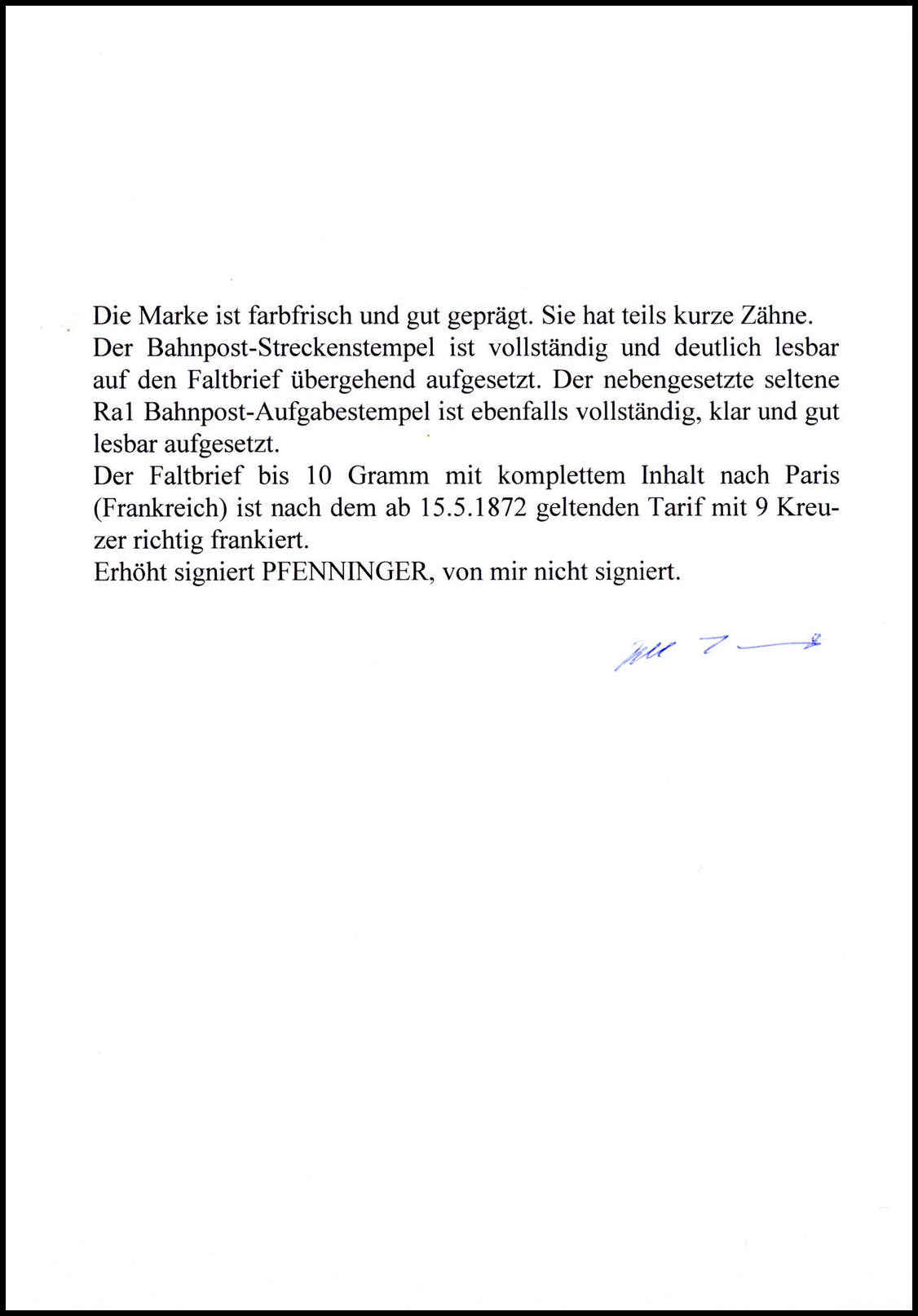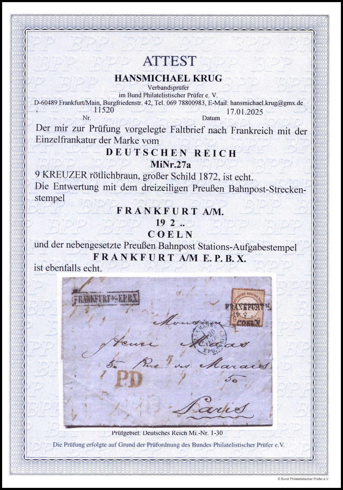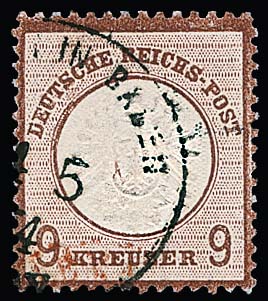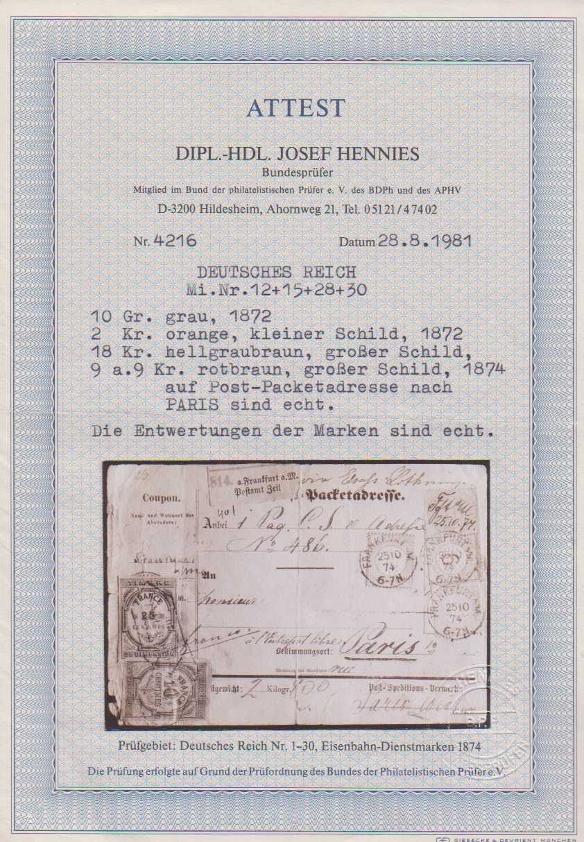 18 Kr. ockerbraun, Luxusstück in perfekter Zähnung, nebst 10 Gr. grau, 2 Kr. orange und 9 a. 9 Kr. rötlichbraun (diese mit kl. verwendungsbed. Beanstandungen) auf kpl. gelber Paketkarte (u.a. gestützte Falte und radierter Empfängername) nach Paris. Klare, zentrische K1 "Frankfurt a.M. 25/10 74", links unten mit zwei franz. Steuermarken zu 10 und 25 C. Ein seltenes Ganzstück mit einer tadellosen 18 Kr. gr. Brustschild, Fotoatteste Hennies, Brugger