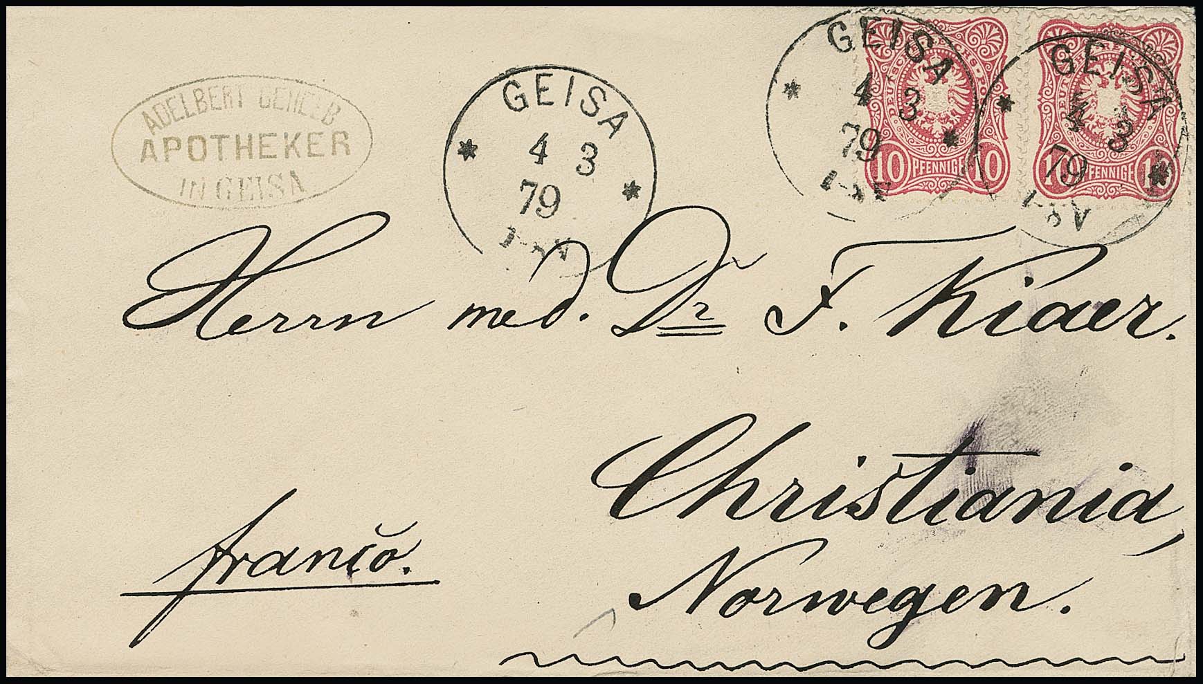 Zwei Briefe aus gleicher Korrespondenz je mit Doppelfrankatur 10 Pfge. von einem Apotheker in Geisa an einen Arzt in Christiania/Norwegen: 1876 mit spät nachverw. Taxis-Zier-K1 (und seltenem Byp.-Neben-K1), sowie 1879 mit neuem K1