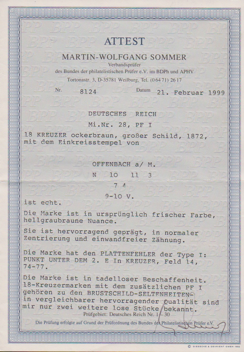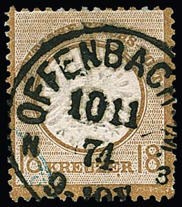 18 Kr. ockerbraun, ausgabetypisch gezähntes Prachtstück mit gut sichtbarem Plattenfehler "Punkt unter zweitem E von KREUZER", sehr schön zentrisch gestempelt mit K1 von Offenbach, unten links kleiner Teil eines blauen, wahrscheinlich französischen Transitstempels. Mi. 3800,-, Attest Sommer ("mir nur zwei weitere lose Stücke bekannt.")