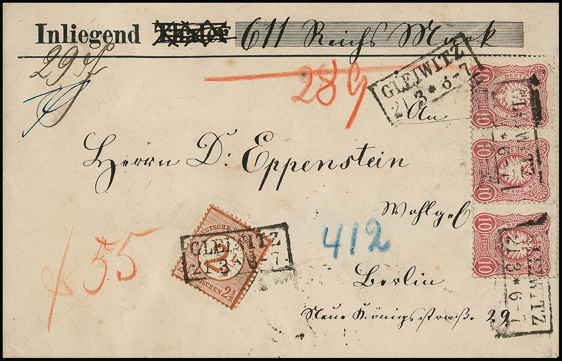2 1/2 a. 2 1/2 Gr. rotbraun in Währungs-Mischfrankatur mit 5 Pfge. lila, Kabinettstücke mit Ra3 "Beuthen i. Oberschlesien 27/10 75" auf sauberem Auslagenbrief, sign. Starauschek, Wiegand-Hb. S. 114
