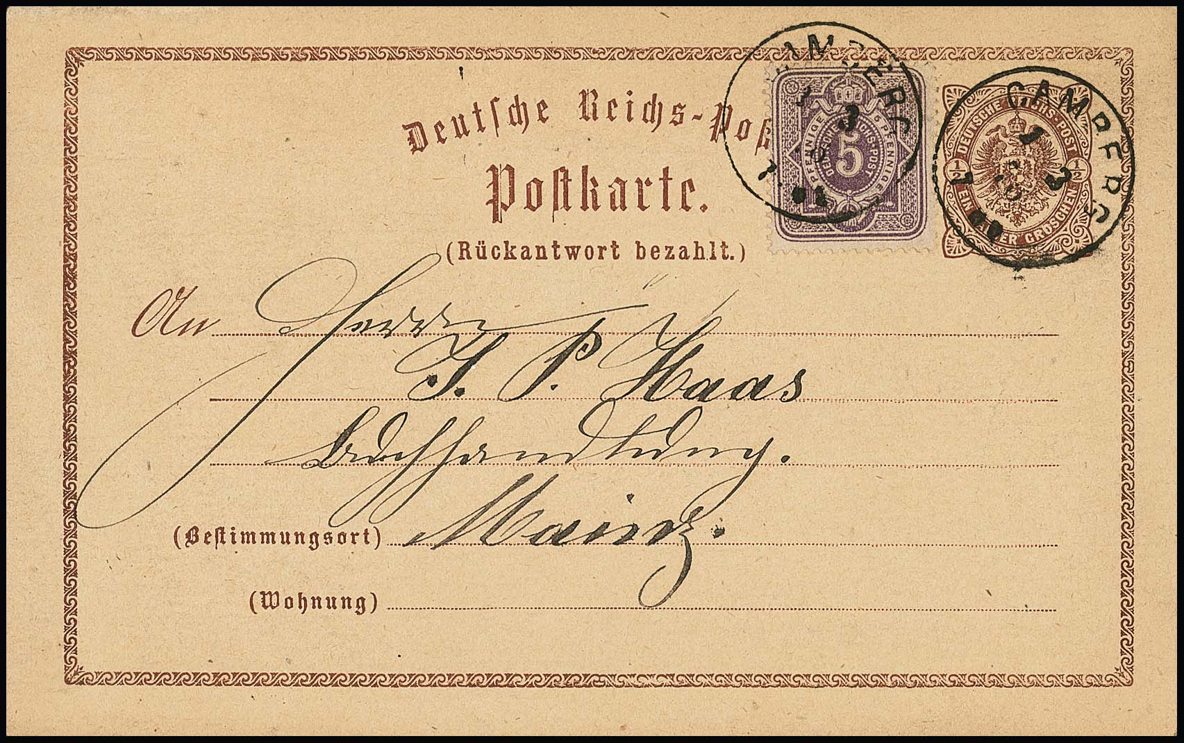 5 Pfge. purpur auf Brustschild-Antwort-Ganzsachenkarte 1/2 Gr. braun, diese als Formblatt verwandt, mit K1 "Camberg" vom 1.3.1876, Fotoexp. Krug