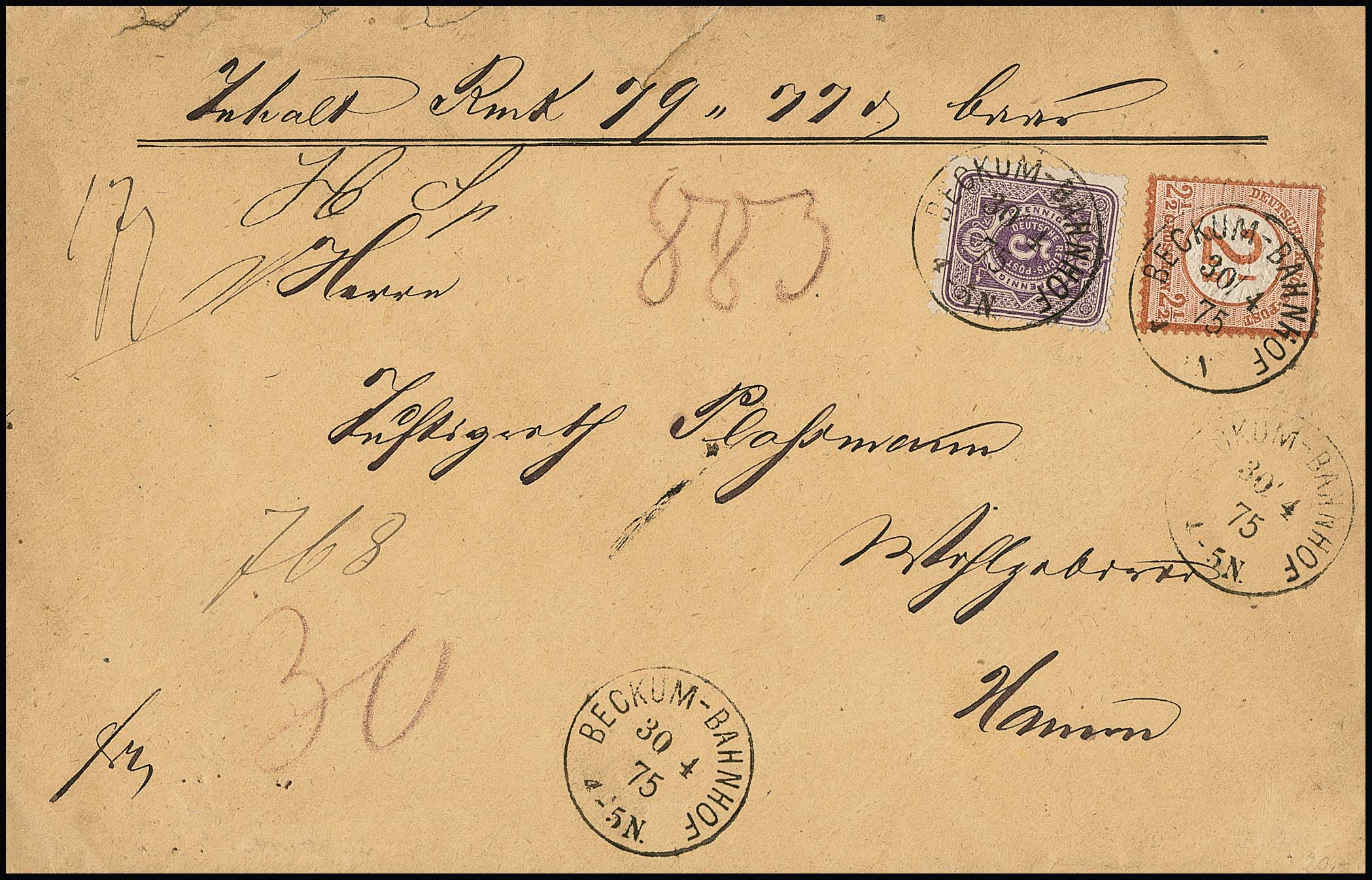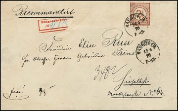 2 1/2 a. 2 1/2 Gr. rotbraun (Eckrep.) als seltene Einzelfrankatur auf eingeschriebenem Leinen-Ortsbrief (also mit größerer Sicherheit bereits über 1 Loth) aus Hannover, 13.4.75, mit erstem R-Zettel mit hs. Nummer