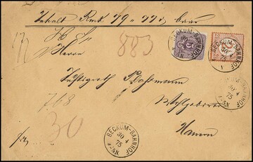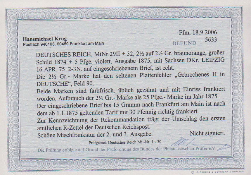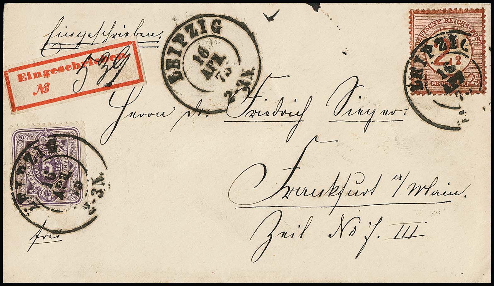 2 1/2 a. 2 1/2 Gr. rotbraun, Plattenfehler "gebrochenes H", in Währungs-Mischfrankatur mit 5 Pfge. violett (unauffällige Aufklebefehler) mit zentr. K2 "Leipzig" 1875 auf Einschreibebrief nach Frankfurt/a.M. mit erstem amtl. R-Zettel der Reichspost, seltener Brief, Fotoexp. Krug, Wiegand-Hb. S. 104
