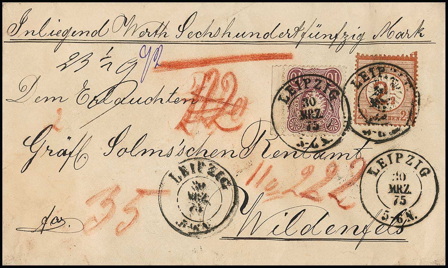 2 1/2 a. 2 1/2 Gr. rotbraun, Kabinettstück in Währungs-Mischfrankatur mit Randstück 10 Pfge. rosa (Bugspur) auf Wertcouvert mit K2 "Leipzig", 20.3.75, nach Wildenfels, hier rs. 5 Pfg. Bestellgeld quittiert. Attest Brugger "Wertbriefe mit Bestellgeld sind selten"