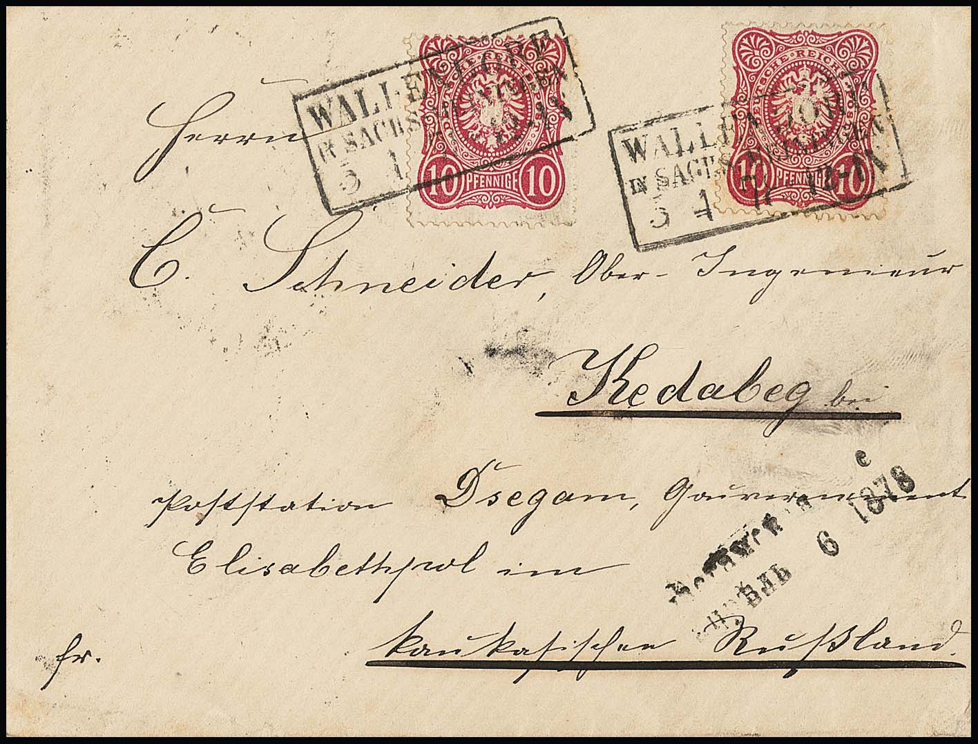 10 Pfge. rosa per zwei (eine leichte Gummitönung) auf Brief von Wallendorf/Sachs.-Mein. 1878 nach Kedabeg/Kaukasien (Rußland), heute Aserbaidschan. Briefe in diese Region Rußlands sind äusserst selten (an einen Ingenieur einer damals von Siemens betriebenen Kupfermine). Dazu Brief 20 Pfge. 1876 nach Poltawa in der Zentral-Ukraine