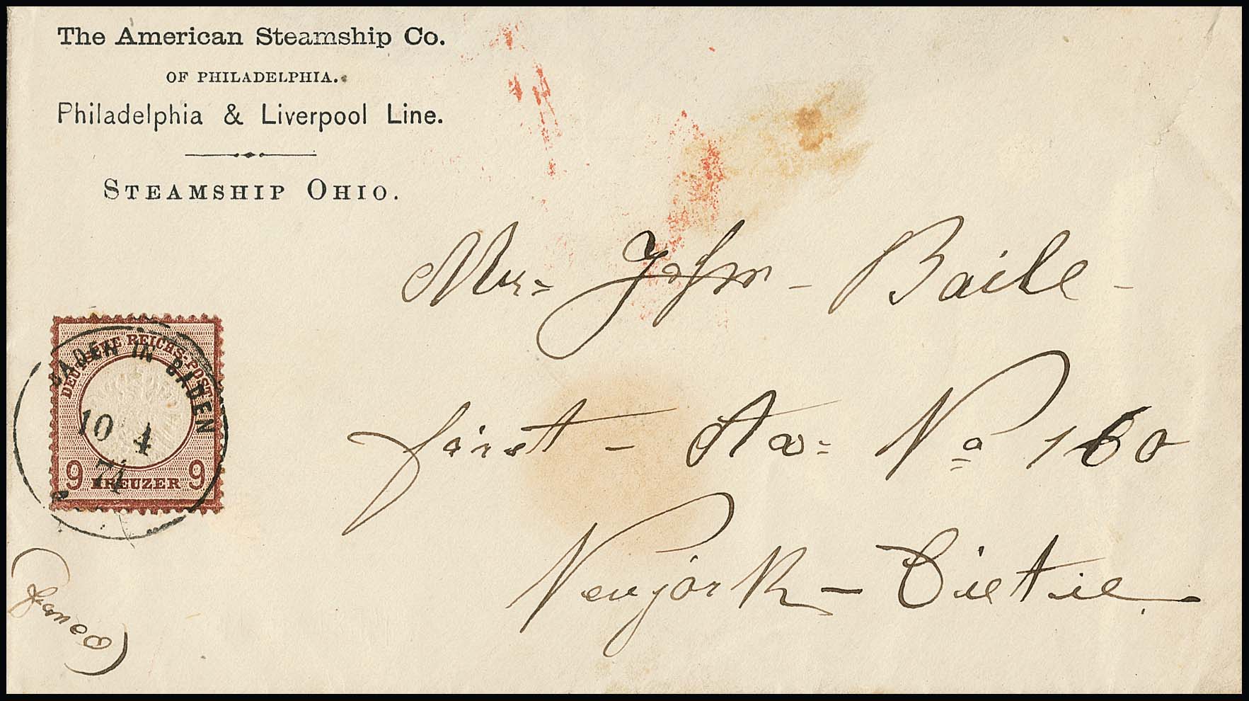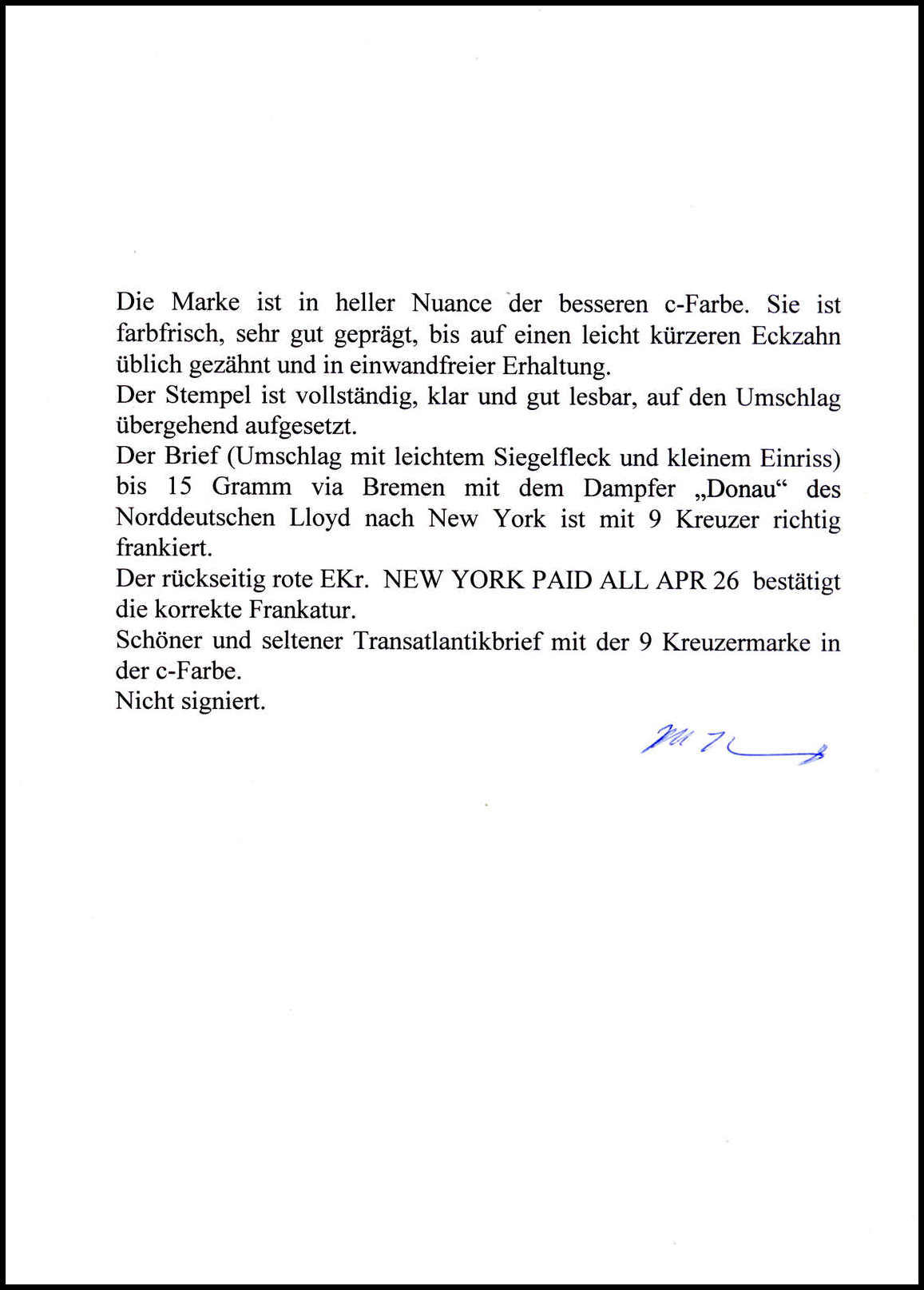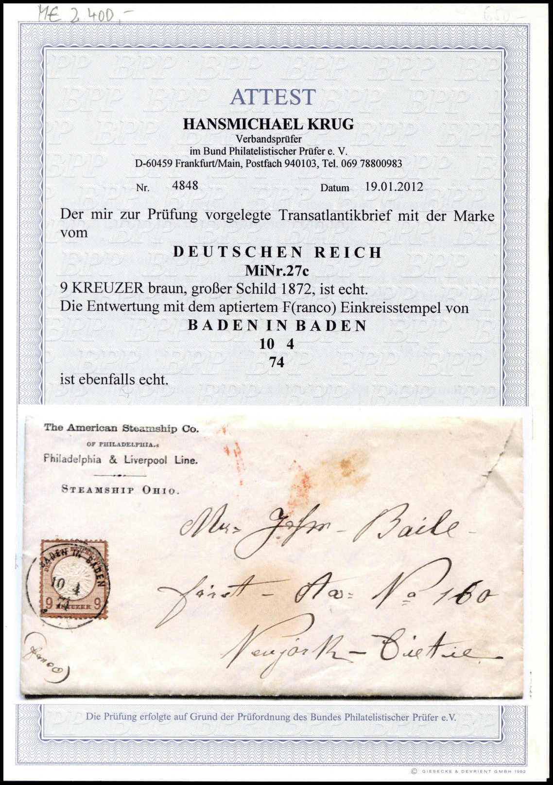 9 Kr. lebhaftbraun, farbfrische Einzelfrankatur (Zähnung min. unregelmäßig) mit zentr. K1 "Baden in Baden 10/4 74" auf Brief mit kpl. Inhalt in die USA (re. kleiner Öffnungsfehler), Fotoattest Krug. Mi. 2200,-