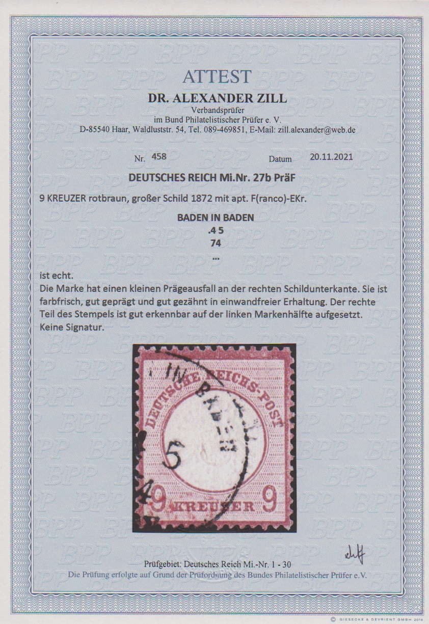 9 Kr. lilabraun, Kabinettstück mit K1 von Baden sowie interessantem Prägeausfall, Attest Zill. Mi. 700,- + PräF