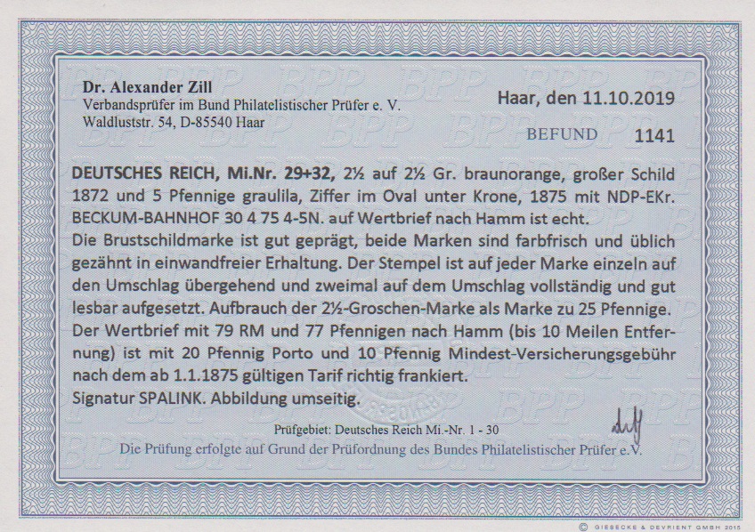 2 1/2 a. 2 1/2 Gr. rotbraun in Währungs-Mischfrankatur mit 5 Pfge. violett, perfekte Exemplare auf Wertcouvert mit besserem NDP-K1 "Beckum-Bahnhof", 30.4.75, nach Hamm. Sign. Spalink und Fotoexp. Dr. Zill "einwandfrei", Wiegand-Hb. S 105