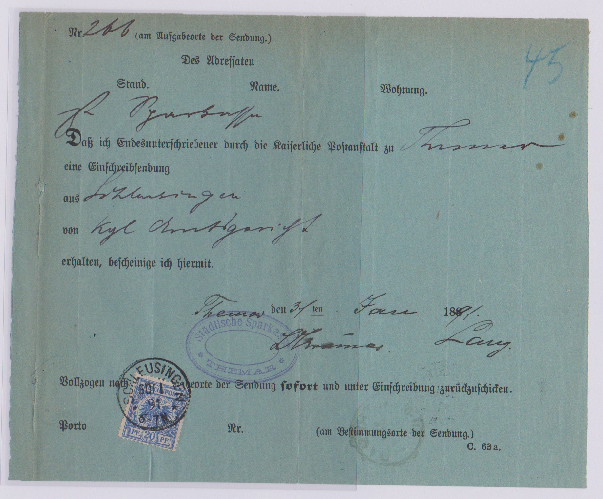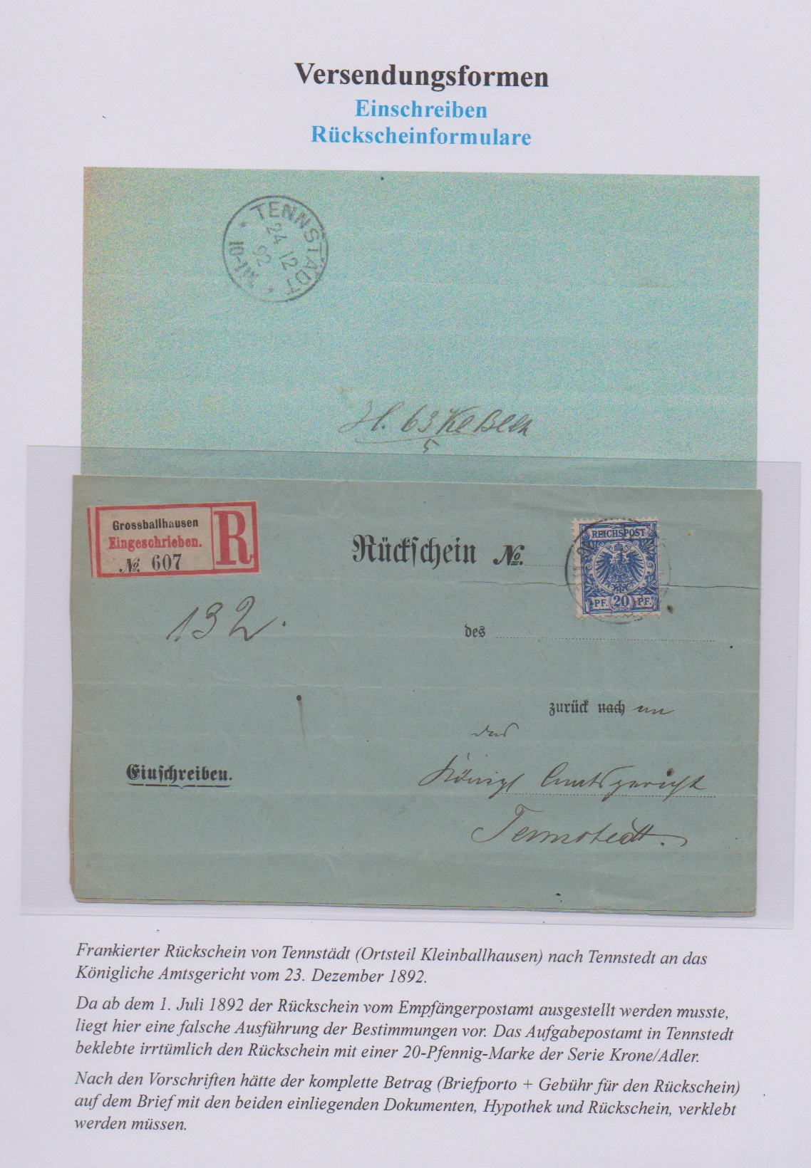 20 Pfg. je einzeln (einmal Bugspur) auf drei Rückscheinen, zweimal innen, einmal aussen frankiert