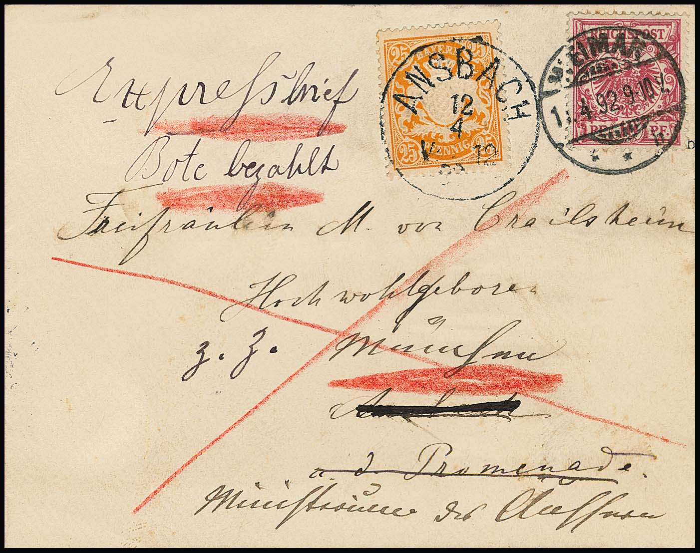 10 Pfg. auf Couvert von Weimar 1892 nach Ansbach/Bayern, von dort mit bayerischer 25 Pfg. orange per Expreß weitergesandt nach München. Zwischen der Reichspost und Bayern bestand Wechselverkehr, so dass die Nachsendung portofrei war und nur die Zusatzleistung "Expreß" nachfrankiert werden musste