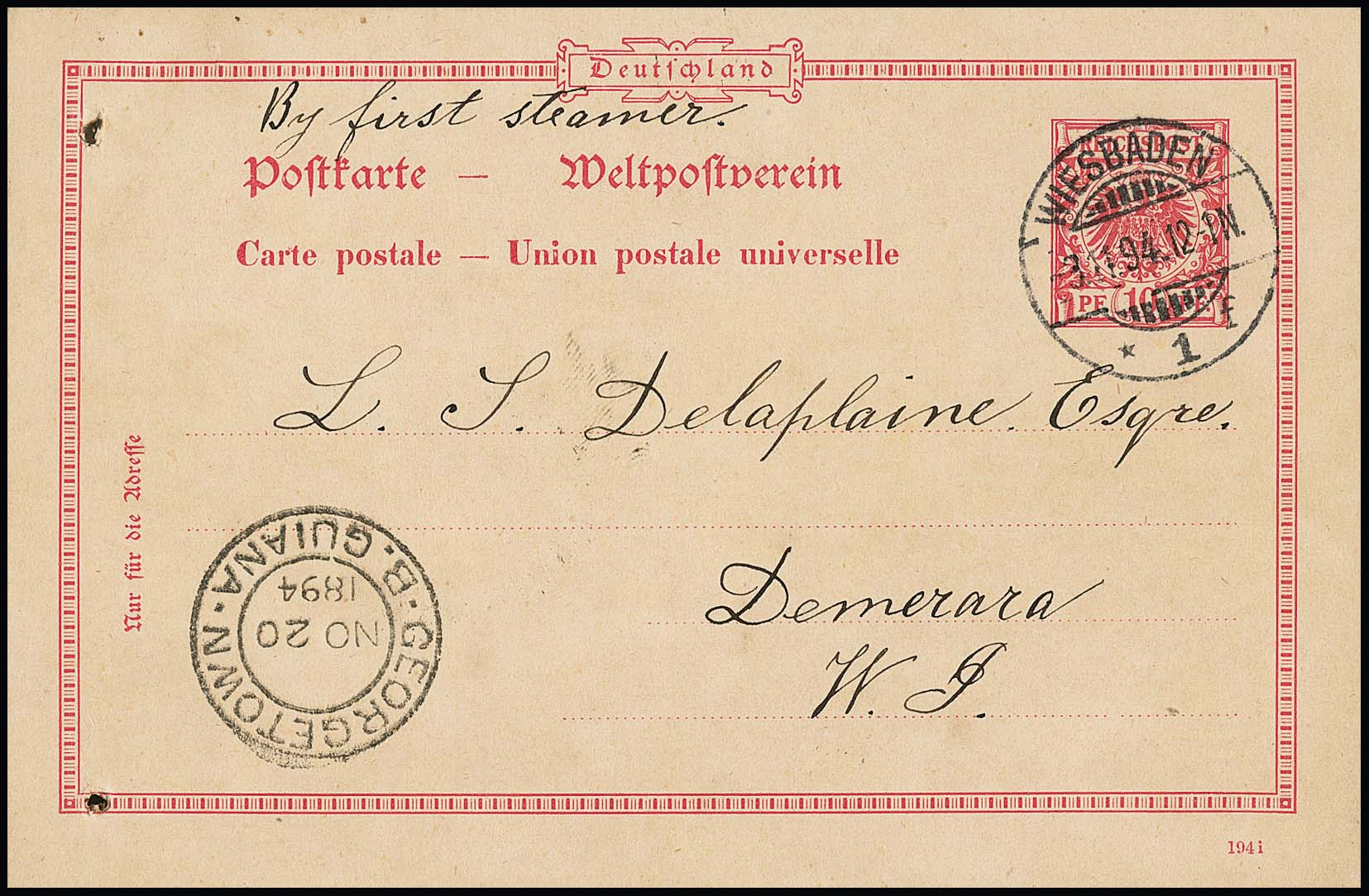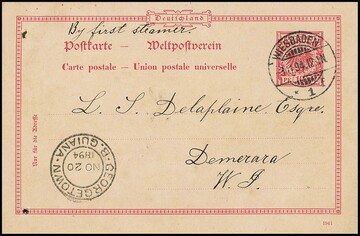 Zwei Ganzsachenkarten 10 Pfg. Krone-Adler mit seltenen Destinationen: 1894 von Wiesbaden nach Demerara/Brit. Guyana, sowie 1899 von Altona nach Sydney/Australien und retour (Laufzeit neun Monate). Dazu dritte Karte 10 Pfg. mit Seepoststempel von Montevideo 1899 nach Bremerhaven