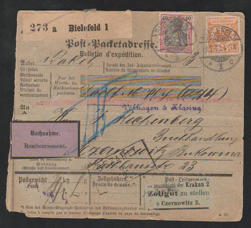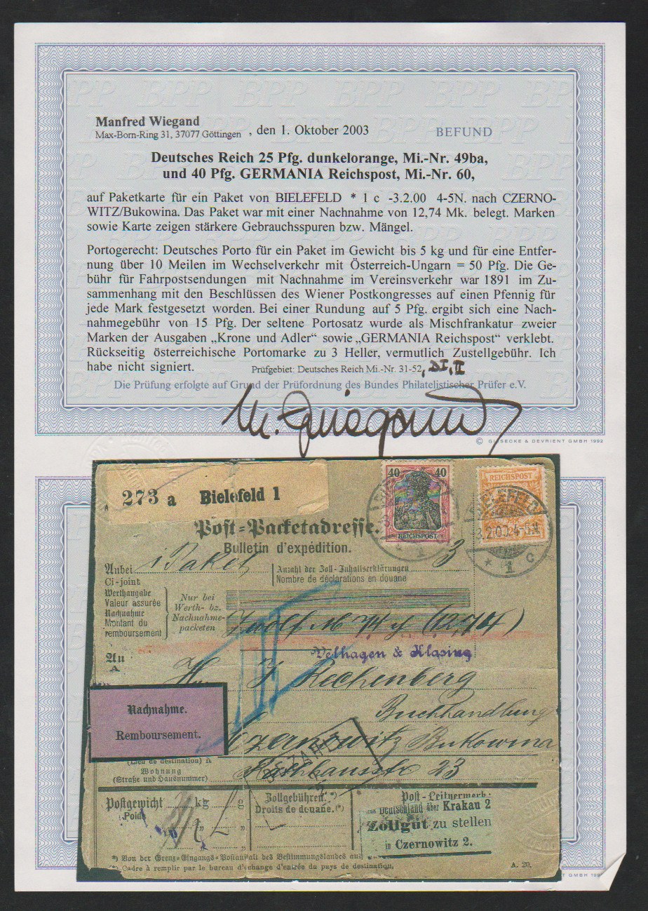 25 Pfg. in MiF mit 40 Pfg. Germania Reichspost auf NN-Paketkarte von Bielefeld 1900 in die Bukowina, vs. österr. Portomarke 3 H., Fotoexp. Wiegand, trotz Mängeln ungewöhnlich