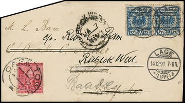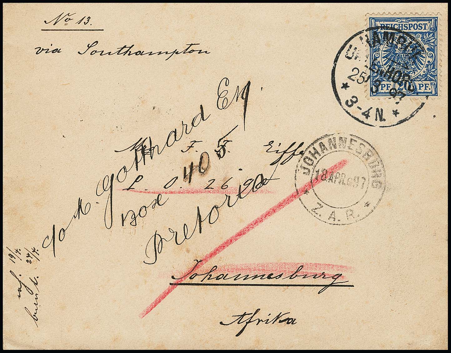 20 Pfg. einzeln auf Couvert von Hamburg 1897 nach Johannesburg/Südafrika, sowie per zwei auf Briefvs. von Lage 1891 nach Cape Town und von dort mit Kap-Marke 1 P. inländisch weitergesandt